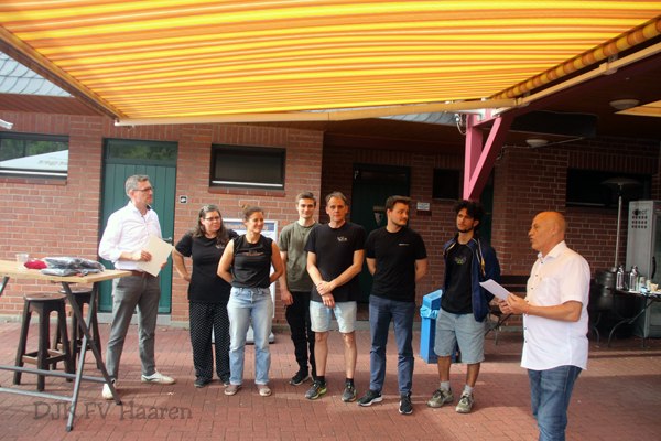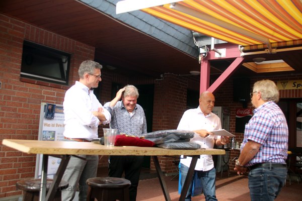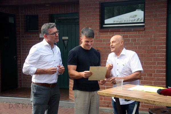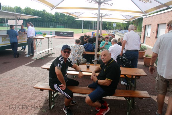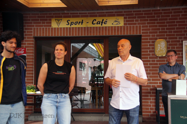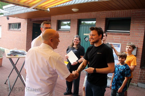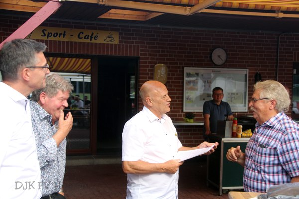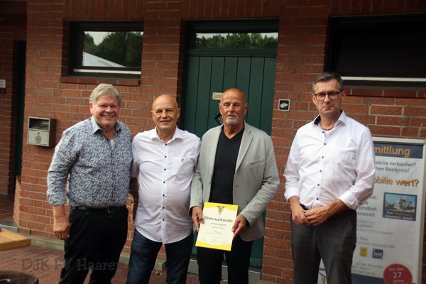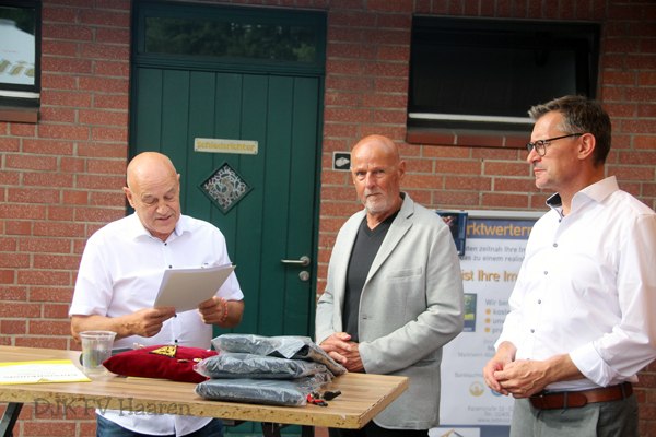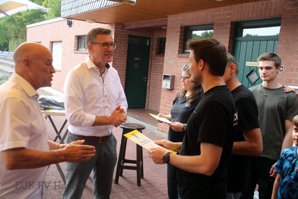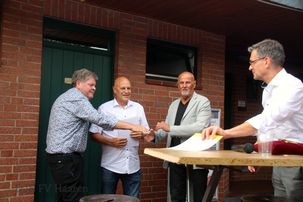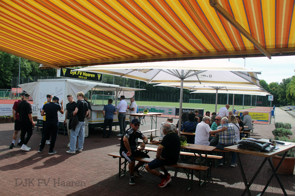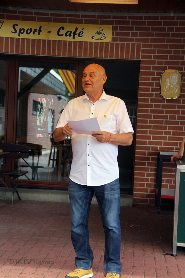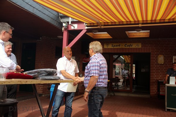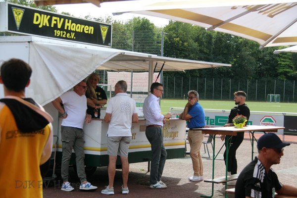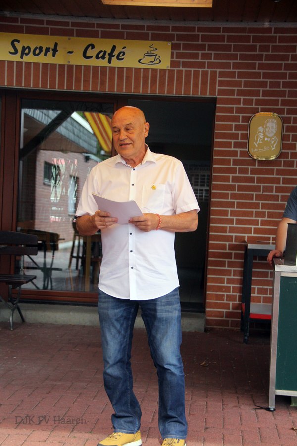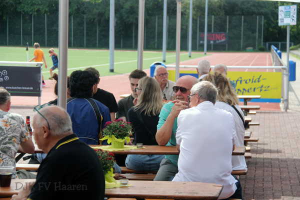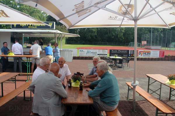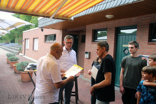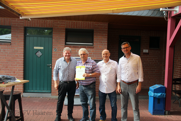 Am gestrigen Samstag feierte der DJK FV Haaren, im Reiner Breier Heim, seinen Vereinsehrentag und bedankte sich bei den zu Ehrenden für ihre Treue und für gute sportliche Leistungen. Bei einem wunderschönen, sommerlichen Nachmittag trafen sich Aktive, Inaktive und einige DJK FV Legenden, bei einem kühlen Bier und einer leckeren Bratwurst. Der führenden Vorstand Adi Hermanns, Bernd Lohmüller und Karl Bellefroid erzählten so manche Geschichten über die zu ehrenden, was immer wieder gut ankommt. Thomas Kammerich und Marcel Hermanns ( 25 Jahre-Silberne Ehrennadel), Peter Bellefroid (40 Jahre – Goldene Ehrennadel). Manfred Kerres ,(70 Jahre Vereinsmitglied), wurde von den Anwesenden laut gefeiert. Sein Herz schlägt 70 Jahre für die Schwarz-Gelben, was in der heutigen Zeit eine Seltenheit ist.